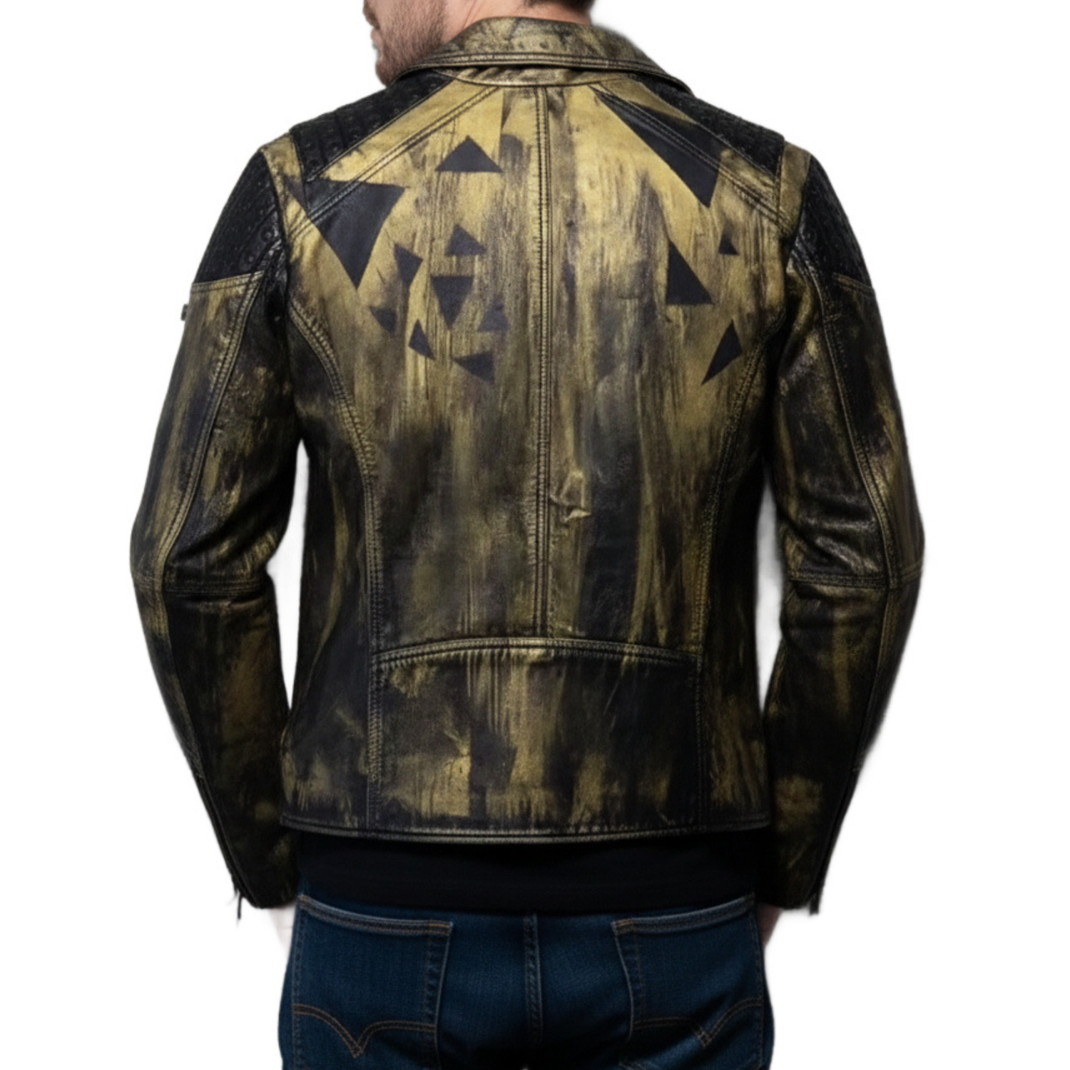 Turn heads with this bold Black and Gold Hand-Painted Studded Leather Biker Jacket, designed for men who appreciate standout style and premium craftsmanship. This biker jacket blends edgy streetwear with luxury detailing, featuring hand-painted gold accents and meticulously placed studs that add a powerful, rockstar-inspired look. Whether you're riding, dressing for a night out, or leveling up your fashion game, this jacket delivers the perfect mix of attitude and artistry.