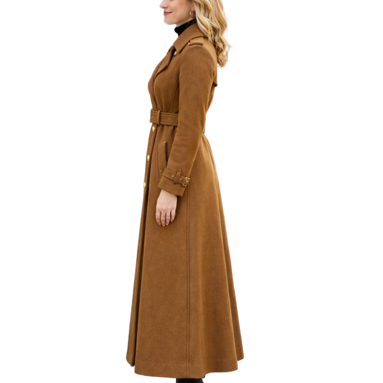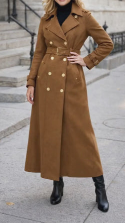 Crafted from high-quality wool fabric, this women’s long trench coat provides exceptional warmth, comfort, and durability during colder seasons. Wool naturally insulates while remaining breathable for extended wear. Designed with strong button closures, a smooth inner lining, precise stitching, and a matching belt for a defined waistline, this double breasted wool trench coat for women ensures both structure and long-lasting elegance throughout fall and winter.