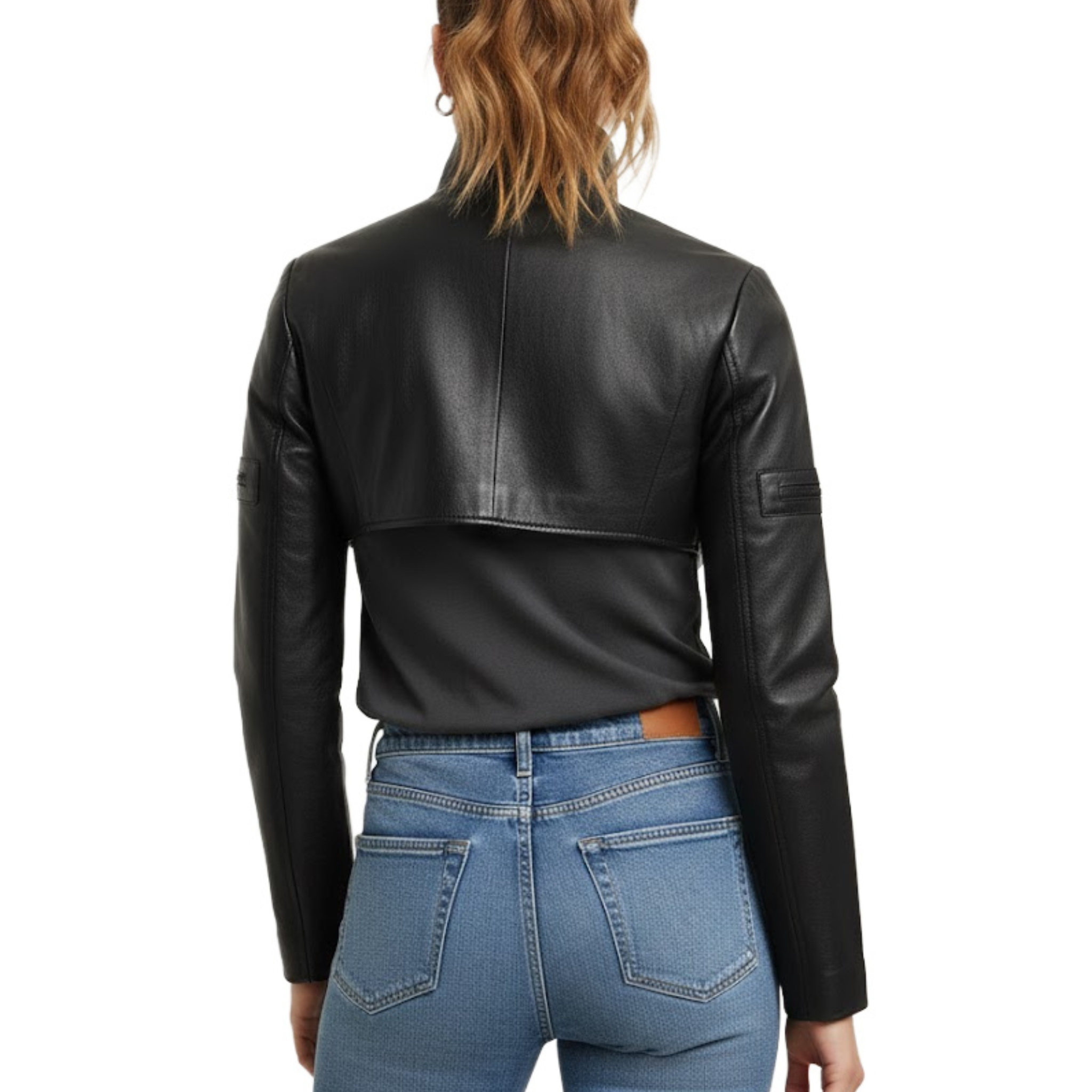 The Women’s Black Leather Cropped Bolero Shrug Jacket is a sleek and stylish layering piece designed to add instant sophistication to any outfit. With its cropped silhouette and tailored fit, this black leather bolero shrug enhances your shape while offering a polished and elegant finish. Its minimalist design makes it perfect for both formal and casual styling, giving you a refined look without adding bulk. Whether worn over dresses or paired with modern separates, this cropped leather jacket is a versatile must-have for every fashion-forward wardrobe.