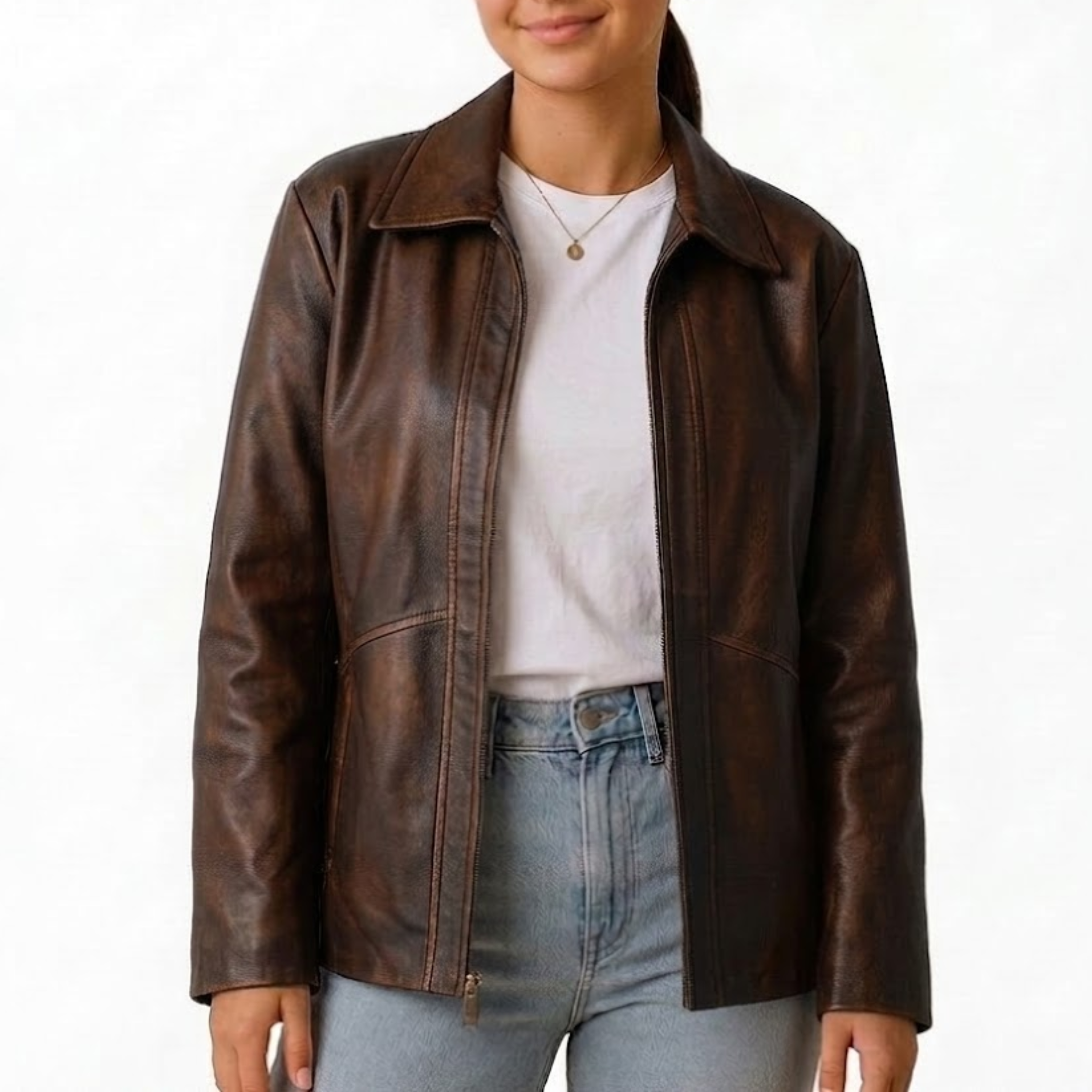 The Women's Blue Wax Vintage Leather Jacket is versatile and easy to style for various occasions. Pair it with black jeans and boots for a classic edgy look, or wear it over a white tee and sneakers for a relaxed casual outfit. For a more polished appearance, combine it with fitted trousers or a dress to create a chic contrast. Add sunglasses or minimal accessories to complete a trendy, fashion-forward ensemble that stands out effortlessly.