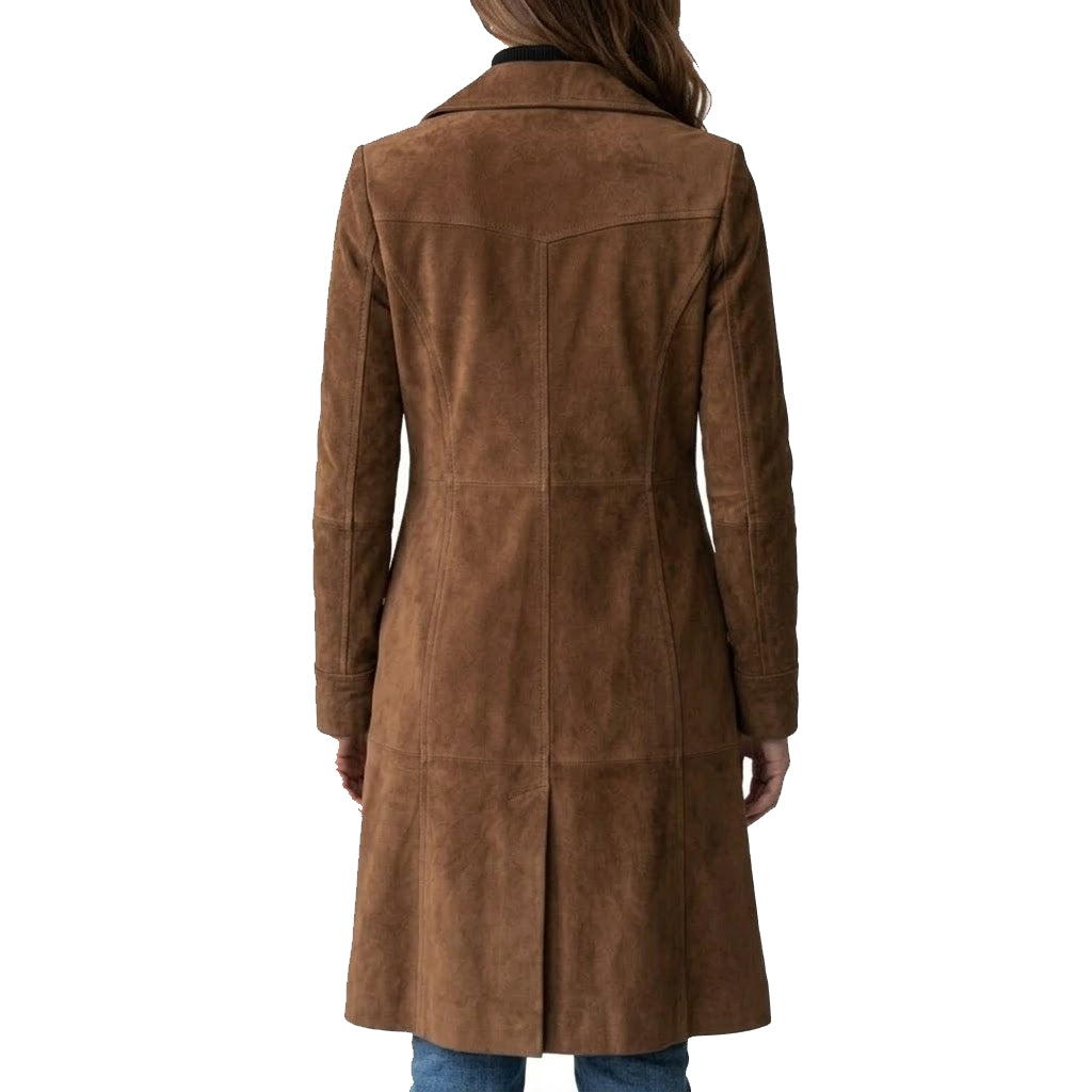 Crafted from high-quality genuine suede leather, this women’s overcoat offers a soft, velvety texture with excellent durability. The premium suede finish provides a luxurious feel while maintaining breathability and flexibility for all-day comfort. The interior is lined with a soft fabric to ensure warmth during cooler seasons. Strong button closures, precise stitching, and high-quality finishing details reflect the coat’s superior craftsmanship and long-lasting performance.