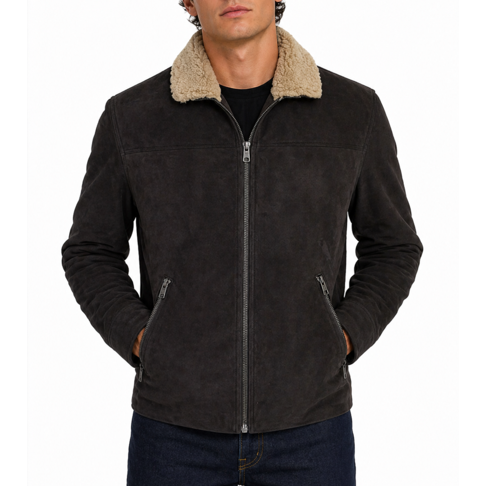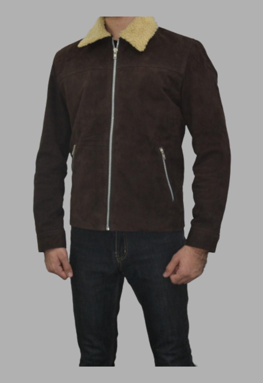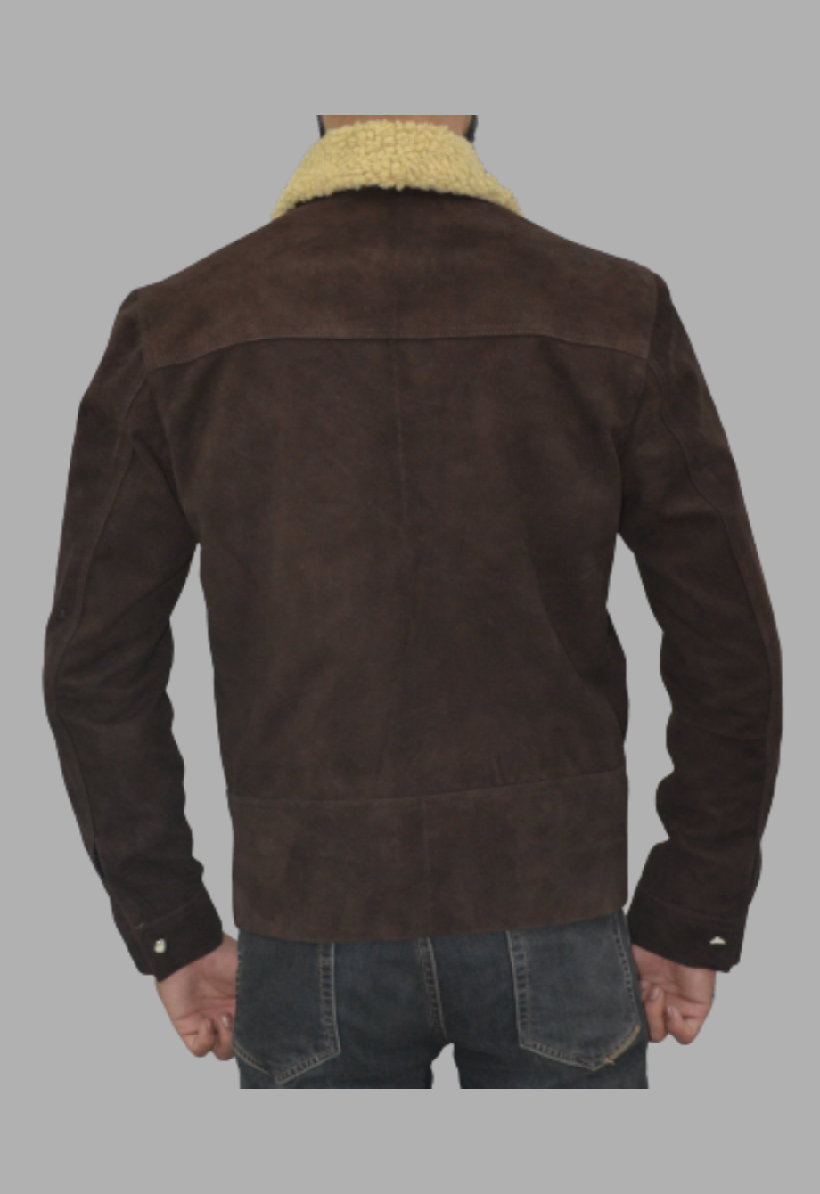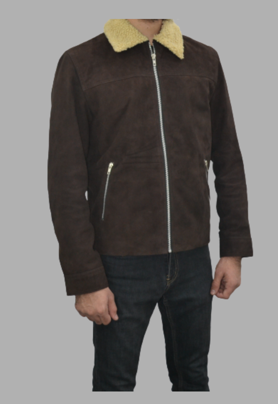 Shearling Collar Distressed Rugged Suede Leather Jacket