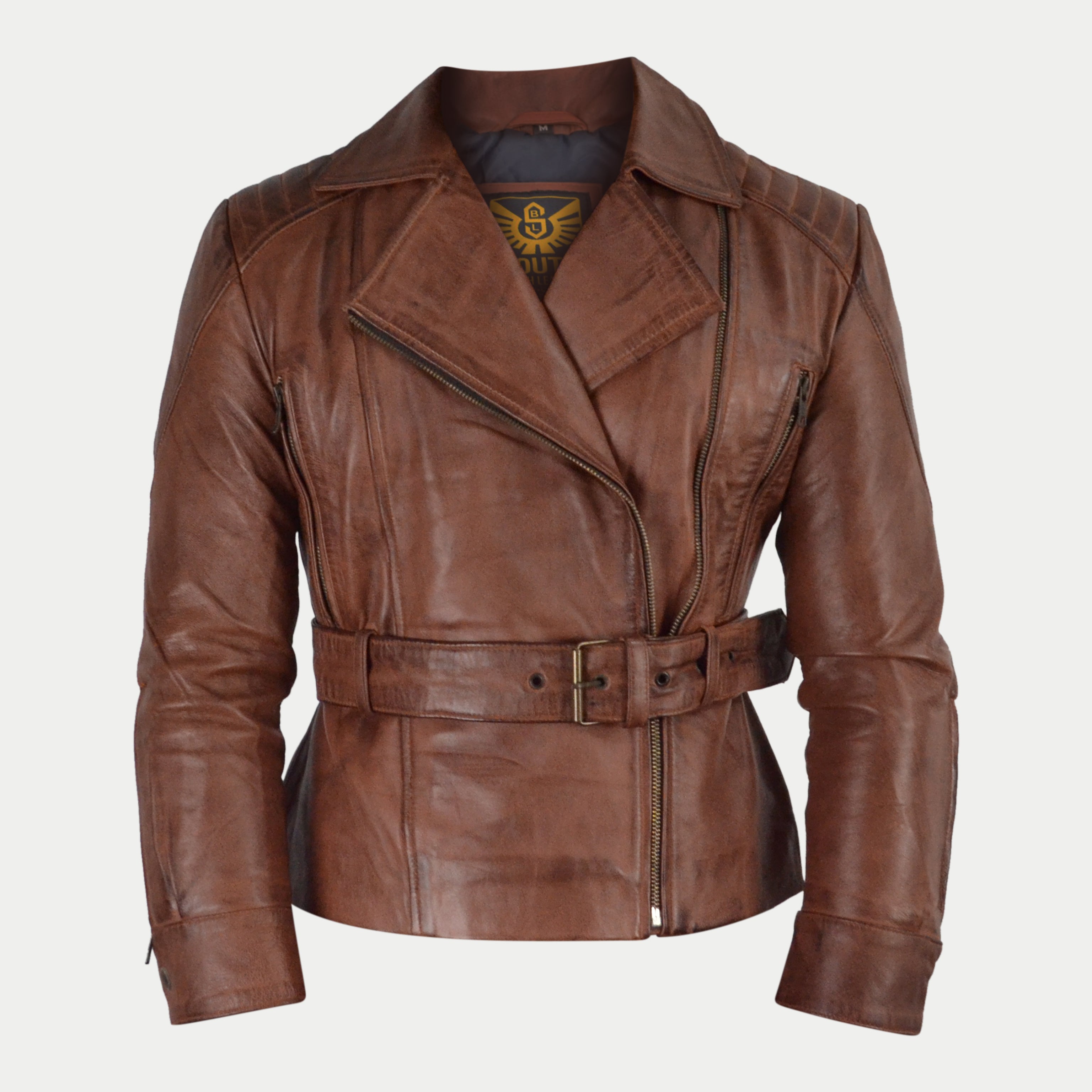 Women's Brown Waxed Motorcycle Genuine Leather Belted Biker Jacket