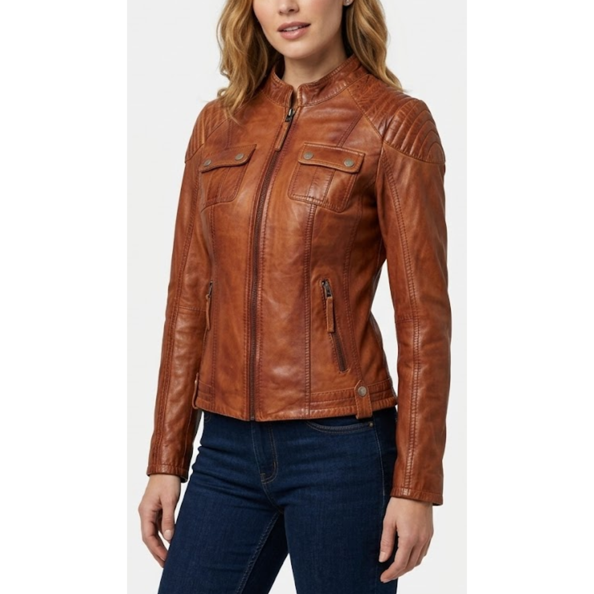 Crafted from high-quality waxed genuine leather, this women’s motorcycle jacket offers durability, flexibility, and long-lasting comfort. The waxed finish not only enhances the vintage look but also provides added resistance against light moisture and wear. The interior is lined with soft fabric to ensure warmth and comfort, making it suitable for cooler seasons. Reinforced stitching, high-quality zippers, and durable hardware reflect premium craftsmanship and ensure long-term reliability.